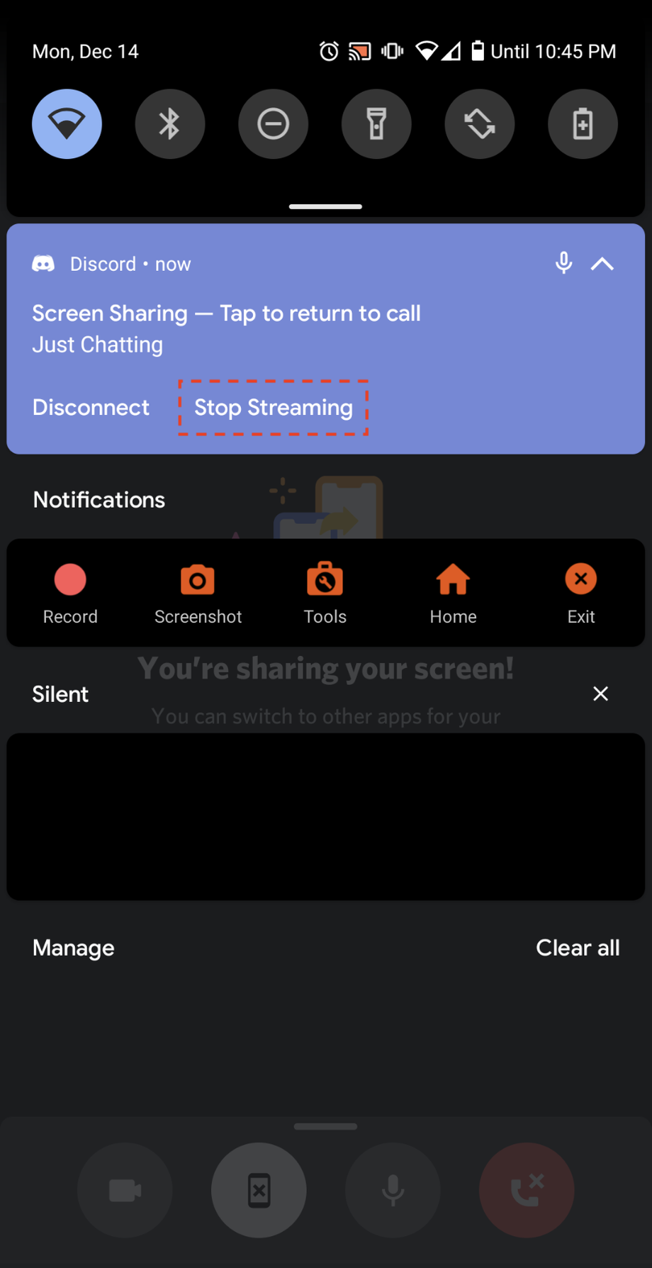 - Or by pressing the “Stop Screen Sharing” button in your device's notification panel.
